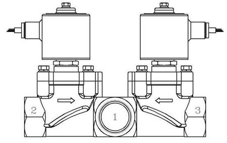 一進二出 1:當電磁閥線圈同時通電時,1通向2,1與3關(guān)閉。